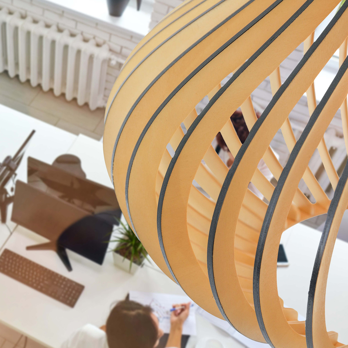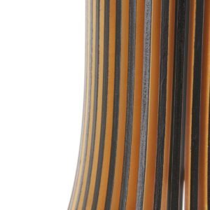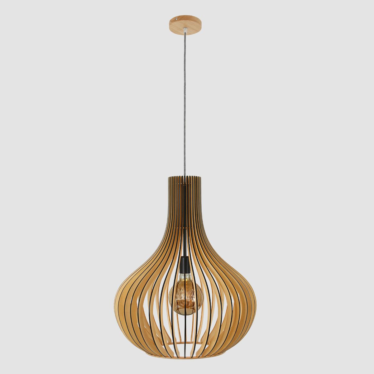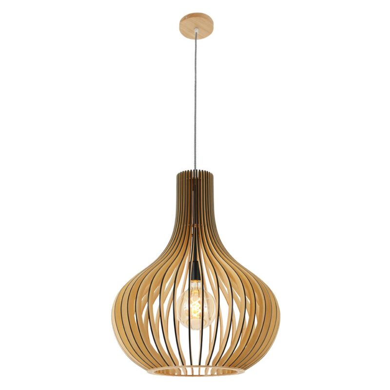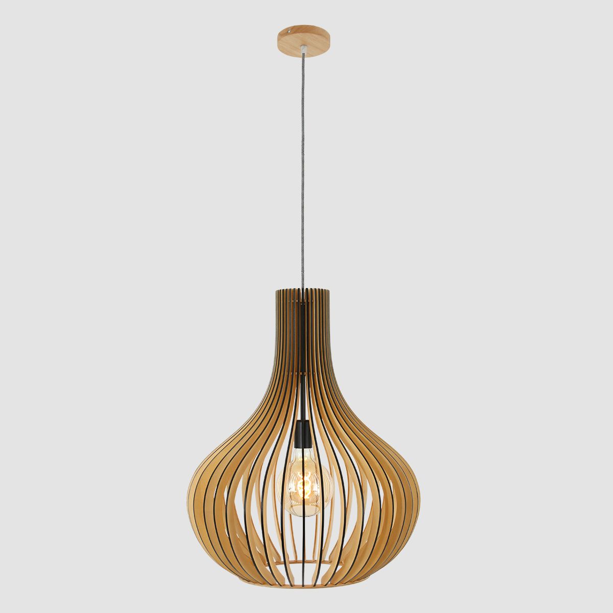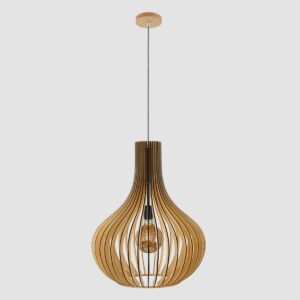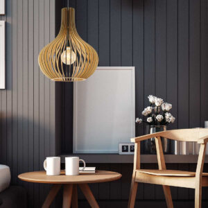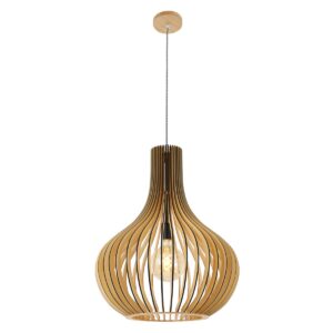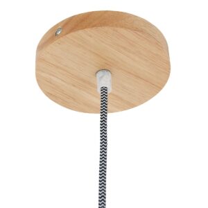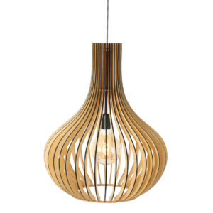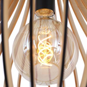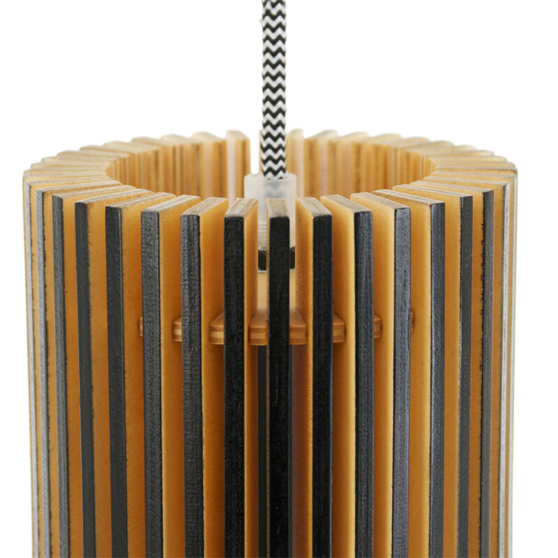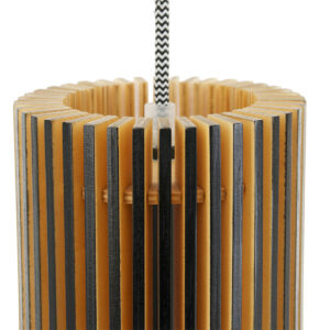 Le bois de peuplier durable est le matériau d’origine de cette suspension Smukt. La couleur chaude du bois et la forme de goutte d’eau arrondie de l’abat-jour donnent une atmosphère chaleureuse. Les lattes verticales se rejoignent élégamment en haut. La lumière provenant de la douille en métal noir est filtrée par les ouvertures. Notez également la finition noire du bois, le cordon en fer à repasser avec motif zigzag et la plaque de plafond en bois.