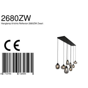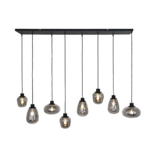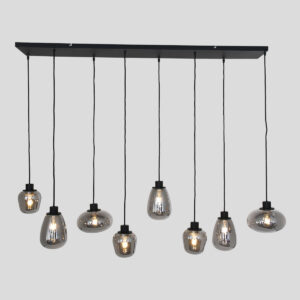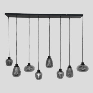 La suspension à 8 lumières de la série Reflexion possède une plaque de plafond rectangulaire de 145 cm de long. Les globes en verre fumé sont suspendus à différentes hauteurs et peuvent être ajustés individuellement lors de l’installation jusqu’à 160 cm. Équipée de huit douilles E27, elle est compatible avec des sources de lumière allant jusqu’à 40 Watts (non fournies). Dimmable avec un variateur externe.