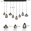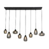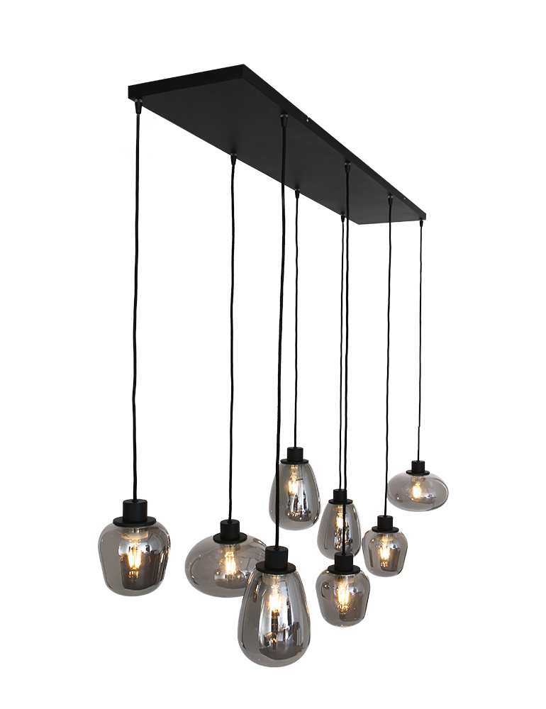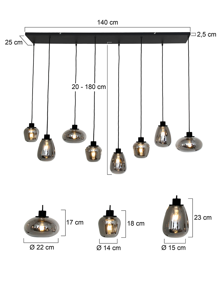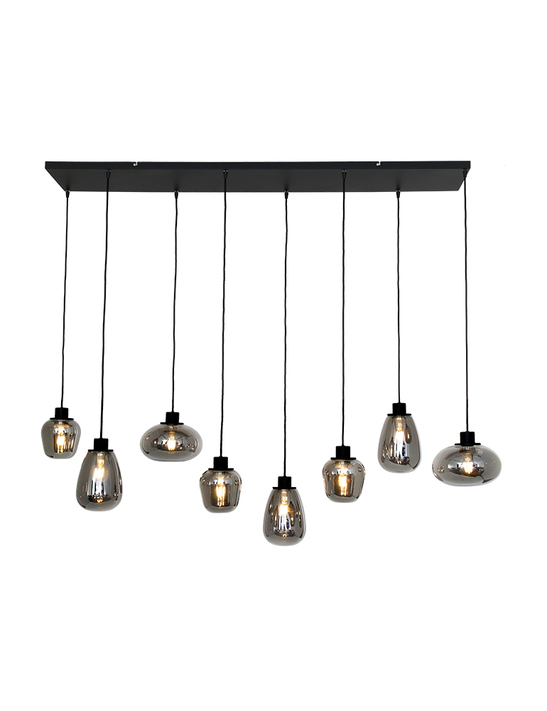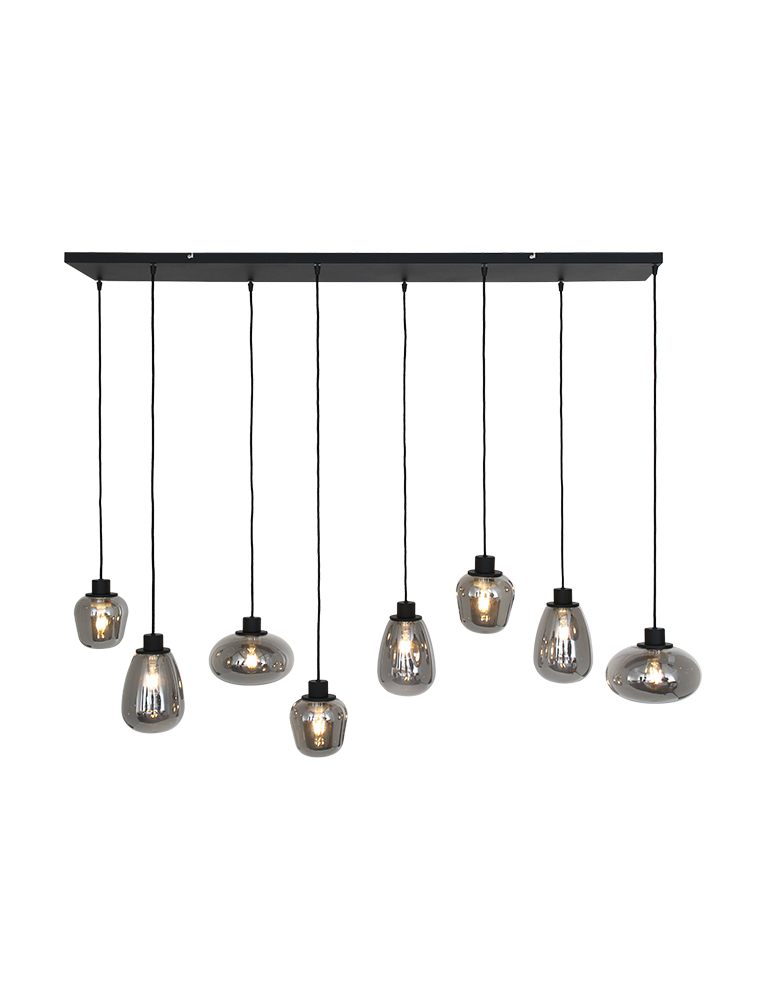 La suspension à 8 lumières de la série Reflexion possède une plaque de plafond rectangulaire de 145 cm de long. Les globes en verre fumé sont suspendus à différentes hauteurs et peuvent être ajustés individuellement lors de l’installation jusqu’à 160 cm. Équipée de huit douilles E27, elle est compatible avec des sources de lumière allant jusqu’à 40 Watts (non fournies). Dimmable avec un variateur externe.