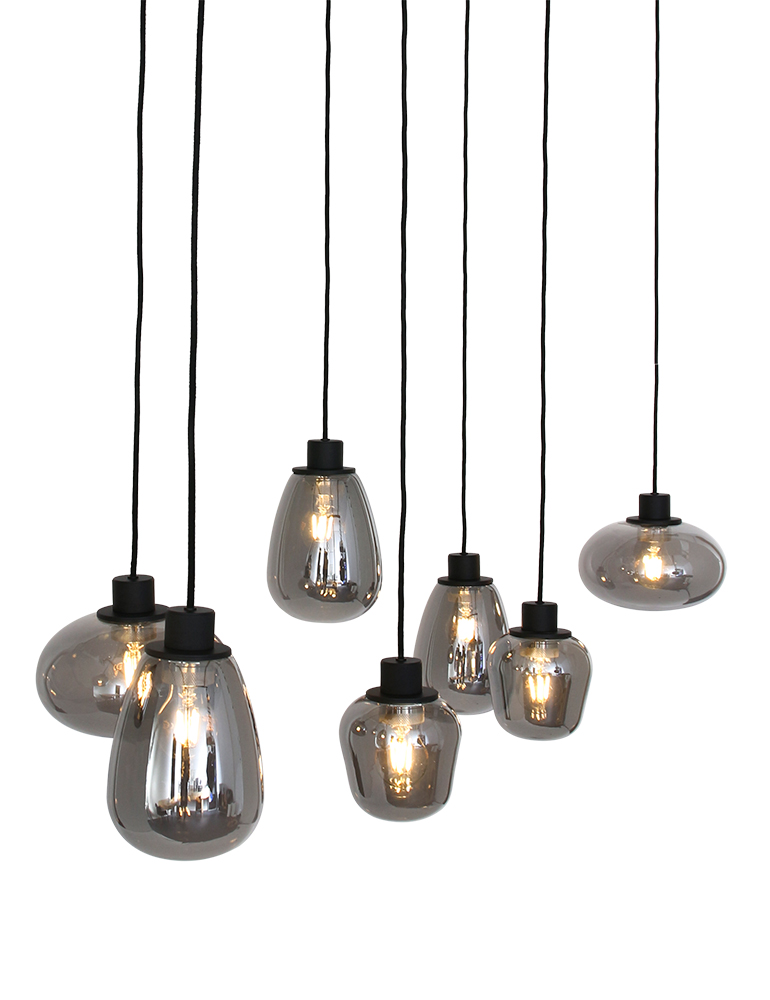 Cette suspension rectangulaire en métal noir Reflexion a incontestablement un effet wow. Sept globes en verre fumé, de différentes formes et tailles, sont suspendus côte à côte. Ils attirent votre regard avec leur lumière réfléchissante envoûtante ! Accrochés à des cordons élégants, ils sont disposés de manière ludique à des hauteurs inégales. La plaque de plafond rectangulaire en métal noir est simpliste. Reflexion donne un coup de fouet direct à une grande table à manger ou à un îlot de cuisine.