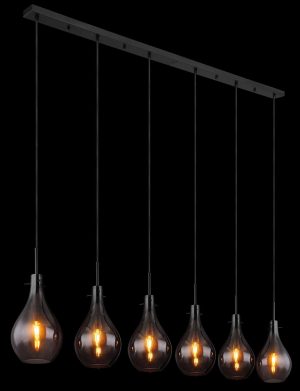Cette suspension de 140 cm de long, fabriquée en métal noir avec six verres fumés, dégage de l’élégance. La lampe dispose de six douilles E14, chacune pouvant supporter jusqu’à 40 watts, vous offrant la liberté d’ajuster l’éclairage selon vos envies. Idéale pour les salons et les salles à manger, elle est recommandée avec des ampoules LED pour des économies d’énergie et une durabilité accrue.