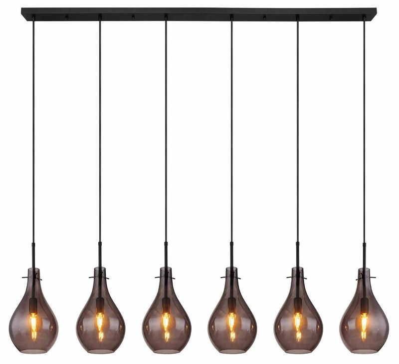 Cette suspension de 140 cm de long, fabriquée en métal noir avec six verres fumés, dégage de l’élégance. La lampe dispose de six douilles E14, chacune pouvant supporter jusqu’à 40 watts, vous offrant la liberté d’ajuster l’éclairage selon vos envies. Idéale pour les salons et les salles à manger, elle est recommandée avec des ampoules LED pour des économies d’énergie et une durabilité accrue.