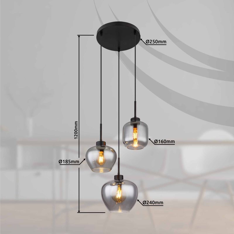 Ce lampadaire suspendu (Ø 38 cm) est fabriqué en métal noir avec des verres fumés. Les trois verres suspendus sont chacun uniques dans leur design et leur taille. Cette lampe artistique, qui s’étend sur 120 cm dans la pièce, possède trois douilles E27 (avec un maximum de 40 watts), permettant un choix libre de source lumineuse. En raison de leur longue durée de vie et des économies d’énergie, nous recommandons des ampoules LED. Ce lampadaire est idéal pour votre salon et votre salle à manger.
