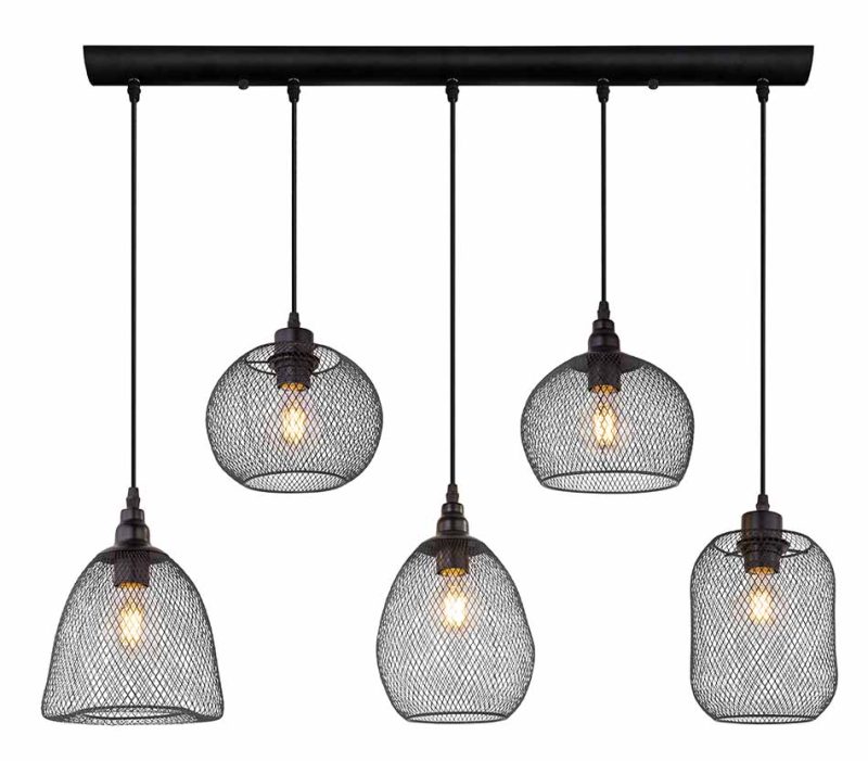 La série de suspensions ANYA fait preuve d’originalité avec sa structure en métal noir et ses cinq éléments suspendus qui se terminent par des connexions E27, entourés d’abat-jours en forme de grille de différentes tailles (diamètre entre 15 et 20 cm). Ajustez l’intensité lumineuse et la couleur selon vos préférences grâce au libre choix des sources lumineuses. Utilisation recommandée d’ampoules LED.
