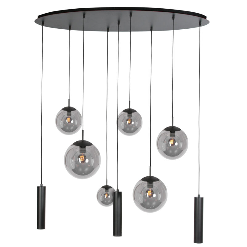 Cette lampe suspendue ovale est conçue comme un véritable point focal au-dessus d’une table à manger ovale. La combinaison de six boules en verre fumé et de trois tubes noirs élégants crée un design ludique mais équilibré, où l’ambiance et la fonctionnalité se rencontrent parfaitement. Les boules en verre diffusent une lumière douce et chaude, tandis que les tubes éclairent directement la table.