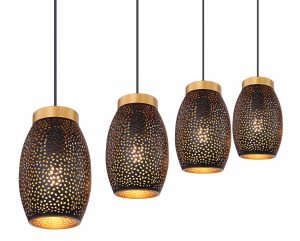 Adoptez la tendance velours actuelle avec la magnifique suspension NARRI qui éclaire votre intérieur d’une manière charmante. Cette lampe d’intérieur, avec une projection de 120 cm, dispose de quatre abat-jours ornés de découpes décoratives uniques et d’un intérieur doré qui crée une ambiance chaleureuse. Grâce au connecteur E14, vous pouvez ajuster l’intensité et la couleur de la lumière vous-même (4 x max.40W). Soyez conscient de l’économie d’énergie et de la durabilité et envisagez d’utiliser des ampoules LED.