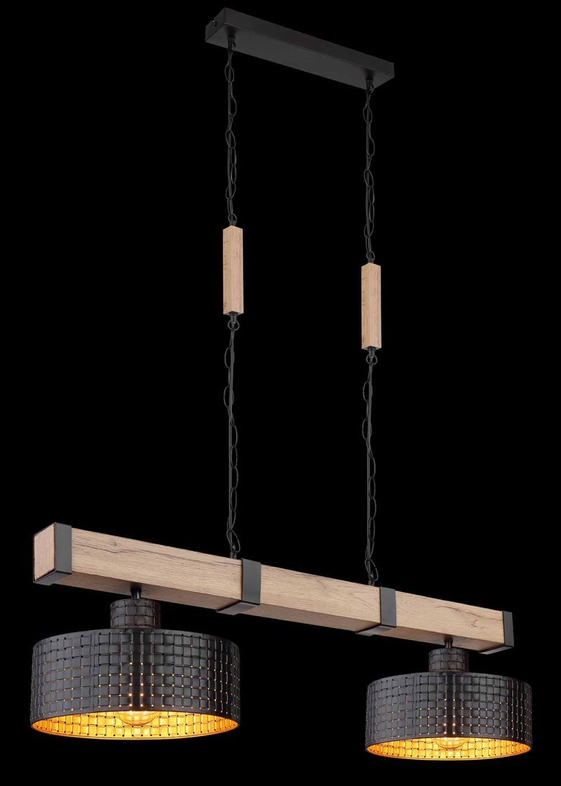 Cette magnifique suspension de la série RIELLY s’inspire d’un design exceptionnel. Deux chaînes en métal noir mènent à un tronc bien formé en imitation bois, sur lequel deux douilles E27 sont dotées d’un abat-jour élégant en noir et or. Avec les connexions E27, vous pouvez déterminer la couleur et la luminosité de la lumière jusqu’à une puissance maximale de 60 watts.