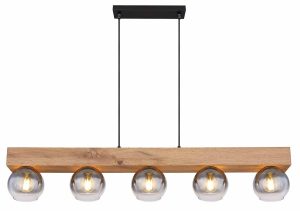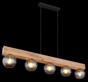 Ce magnifique plafonnier de la série MOITAS s’inspire d’un design exceptionnel. D’un montage de plafond rectangulaire noir, deux câbles noirs de 1,2 m de long dépassent jusqu’à un bloc en bois (115×15 cm). Il y a cinq douilles E27, chacune avec un abat-jour en verre de couleur fumée. Avec les raccords E27, vous pouvez décider vous-même de la couleur de la lumière et de la luminosité jusqu’à une puissance maximale de 40 watts.