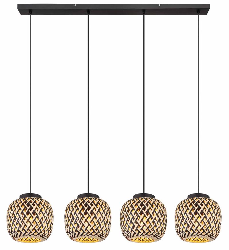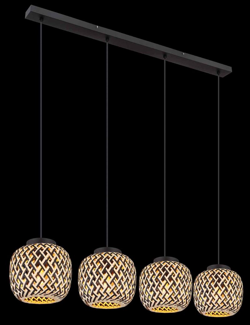 Ce plafonnier de la série COLLY combine le bambou et le métal pour un design impressionnant. Quatre câbles noirs de 1,2 m de long sont fixés à une étroite fixation métallique au plafond et sont équipés de capuchons en bambou dans des couleurs noires et naturelles. Chaque câble dispose d’un socle E27 pour des ampoules jusqu’à 15 watts, vous permettant d’ajuster la luminosité et la couleur de la lumière selon vos envies. Cette lampe apporte une atmosphère chaleureuse et naturelle à votre intérieur.