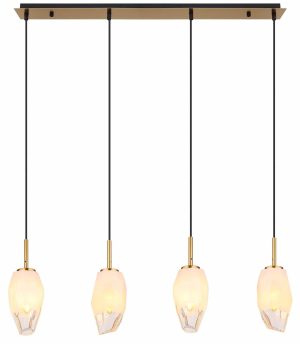 La suspension de la série BARCLEY, réalisée dans un métal de couleur laiton chic et combinée avec du verre opale et transparent, offre une solution d’éclairage ambiance et efficace pour toutes les pièces de taille moyenne. Le cordon noir en PVC teinté ajoute une touche contemporaine au design. Avec des dimensions de 900x110x1200mm et les ampoules nécessaires de 4x E14 LED 7W 230V (non incluses), elle assure un éclairage lumineux. La combinaison de verre opale et transparent permet une lumière agréablement tamisée, faisant de cette lampe un choix élégant pour tout intérieur.