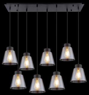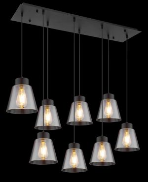 Cette suspension de la série Gumba séduit par son design épuré en métal noir mat et en verre fumé. Elle se compose d’une plaque métallique rectangulaire (94×24 cm) à laquelle sont suspendus huit câbles noirs. Ceux-ci sont équipés d’abat-jours en verre fumé en forme de cône (ø 19 cm), qui peuvent être complétés par des ampoules E27 au choix. Cela vous permet de déterminer la couleur et la luminosité de la lumière de manière individuelle. De plus, la hauteur de la suspension peut être ajustée jusqu’à 120 cm lors de l’installation. Avec d’autres modèles de la même série, vous pouvez créer une ambiance élégante dans votre intérieur et compléter l’ensemble.