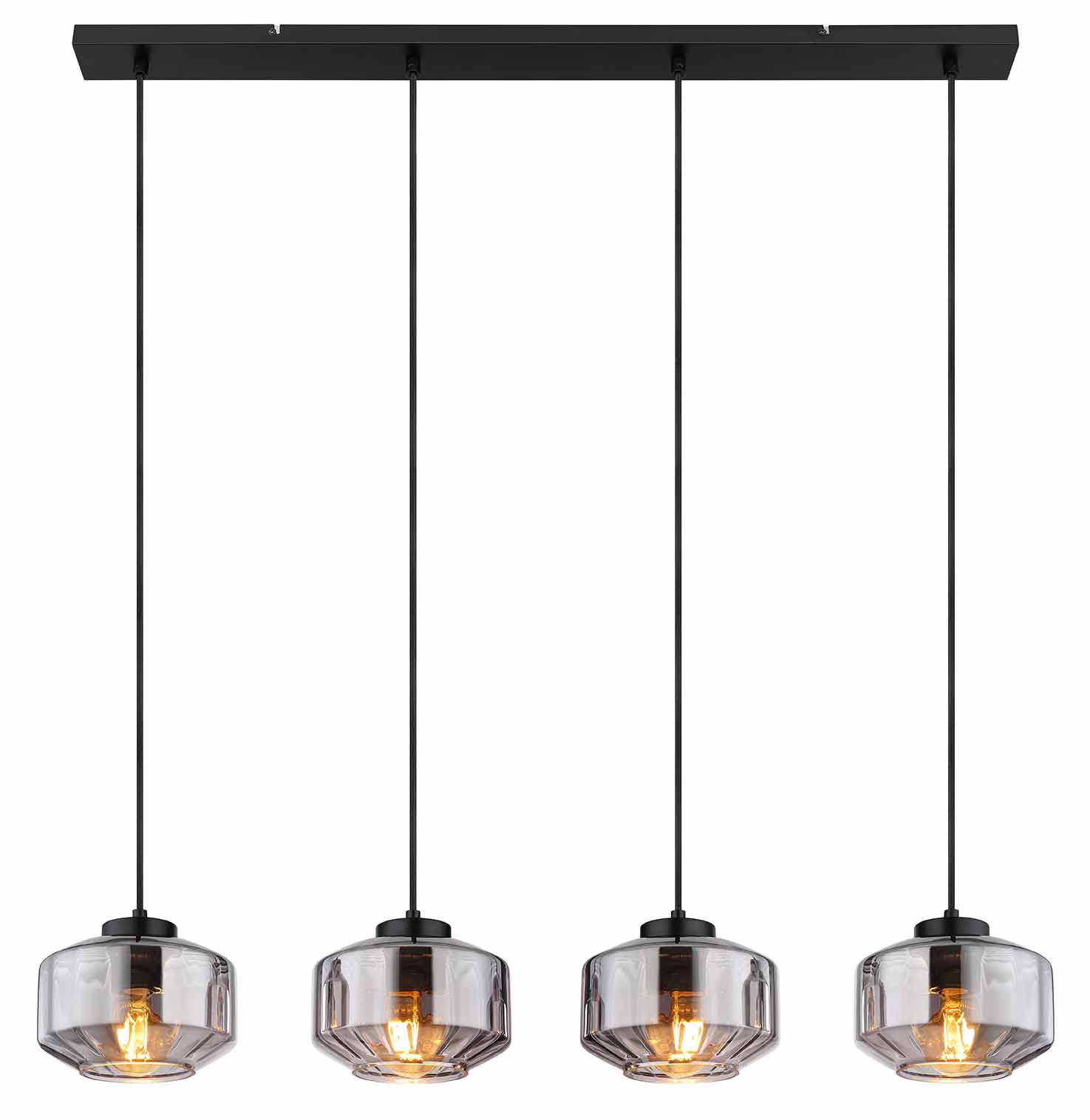 Ce beau plafonnier s’inspire d’un design exceptionnel. Quatre câbles de 1,2 m sortent d’un support de plafond étroit de 1 m de long, chacun se terminant par un culot E27 avec des abat-jours en verre fumé élégant (Ø 18 cm). Avec les culots E27, vous pouvez choisir vous-même la couleur et la luminosité de la lumière jusqu’à une puissance maximale de 40 watts. En raison de leur longue durée de vie et de leur économies d’énergie, nous recommandons des ampoules LED.