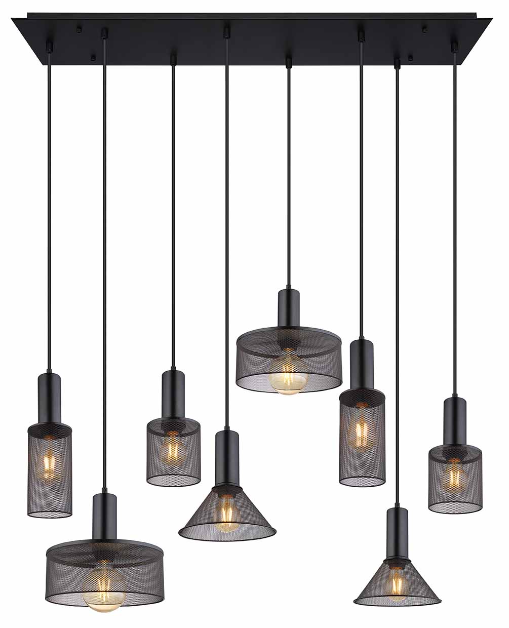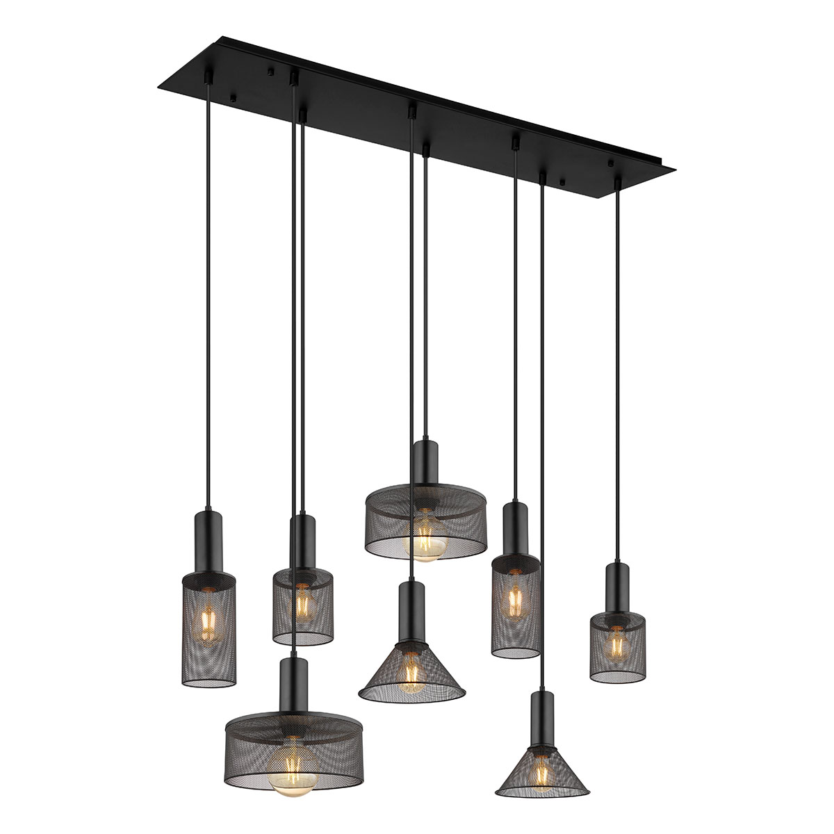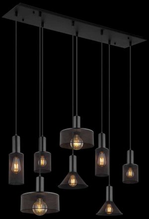 Ce magnifique plafonnier de la série JEDD s’inspire d’un design incroyable. À partir d’un support de plafond rectangulaire mat noir (118 x 40 cm), huit câbles de longueurs différentes, jusqu’à 1,2 m, mènent chacun à une connexion E27. Ceux-ci sont équipés de parapluies différents en treillis métallique noir. Avec les connexions E27, vous pouvez déterminer vous-même la couleur et la luminosité de la lumière jusqu’à une puissance maximale de 60 watts. En raison de leur longue durée de vie et de leur économie d’énergie, nous recommandons des ampoules LED.