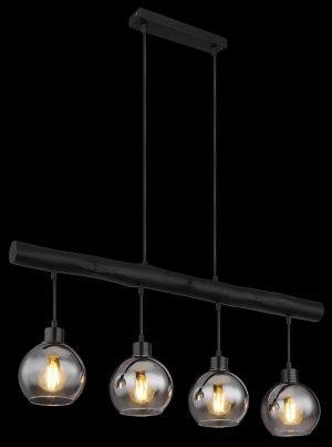 La suspension de la série MOITAS, conçue dans un style moderne, impressionne par son design exceptionnel. D’un montage de plafond rectangulaire, deux câbles descendent vers une poutre en bois de 85 cm de long, noire, sur laquelle se trouvent quatre douilles E27, chacune avec un abat-jour en verre fumé. En raison de leur longue durée de vie et de leur économie d’énergie, nous recommandons des ampoules LED.