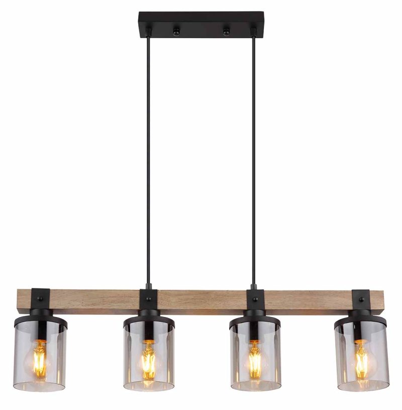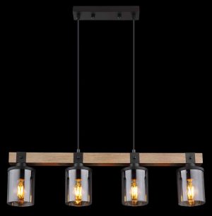 Ce magnifique luminaire suspendu s’inspire d’un design exceptionnel. Deux câbles noirs s’étendent d’un support de plafond étroit vers un coffret en bois de 73 cm de long. Sur le cadre en bois, quatre douilles E27 sont installées, chacune avec un abat-jour fumé en forme de cylindre (Ø10 cm). Grâce au libre choix des sources lumineuses, vous pouvez déterminer vous-même la couleur ou l’intensité de la lumière jusqu’à une puissance maximale de 60 watts. Créez de nouveaux accents dans votre espace.